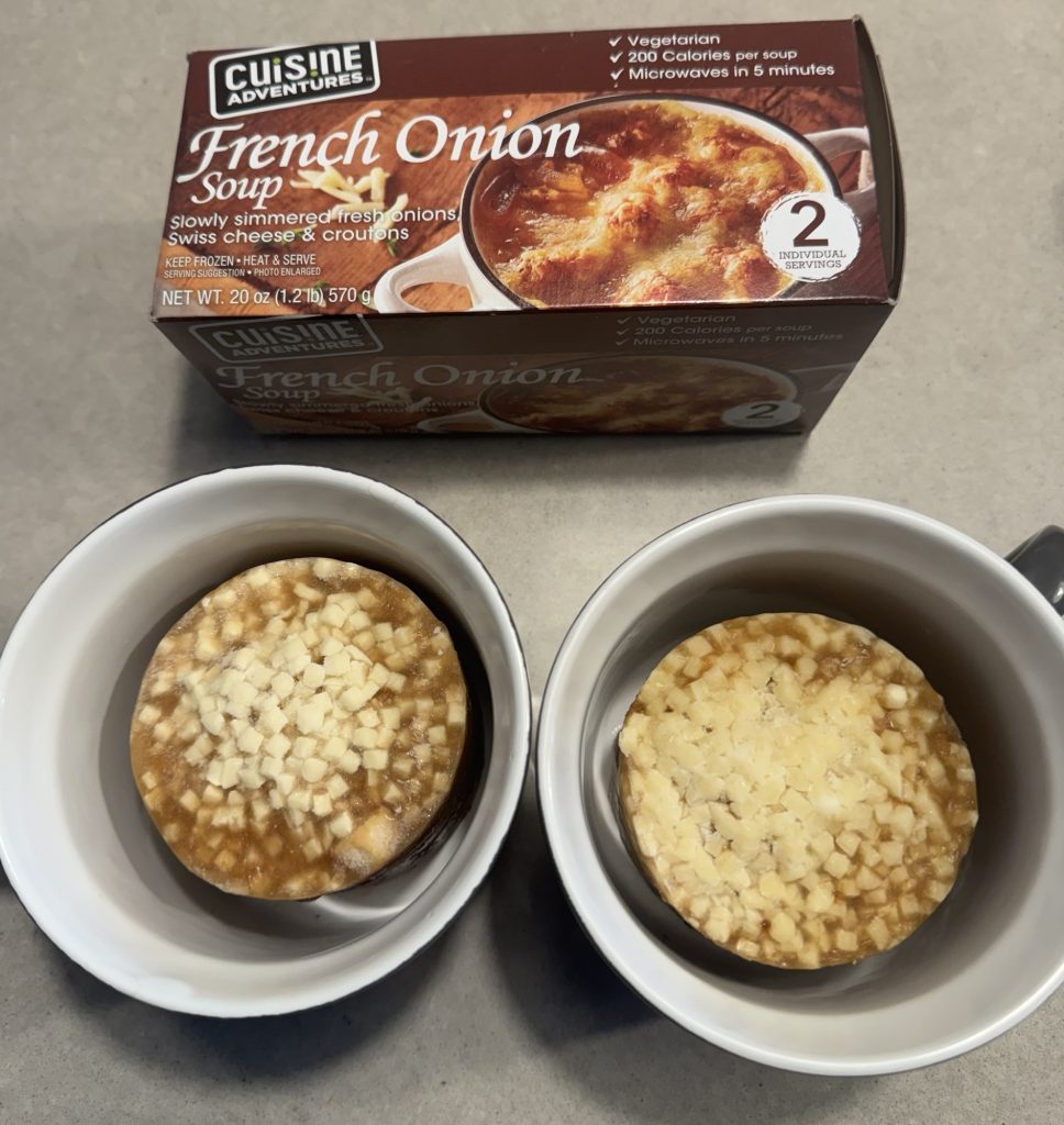 I usually default to Campbell’s French Onion Soup with extra Alpine cheese and croutons, so that’s my baseline.