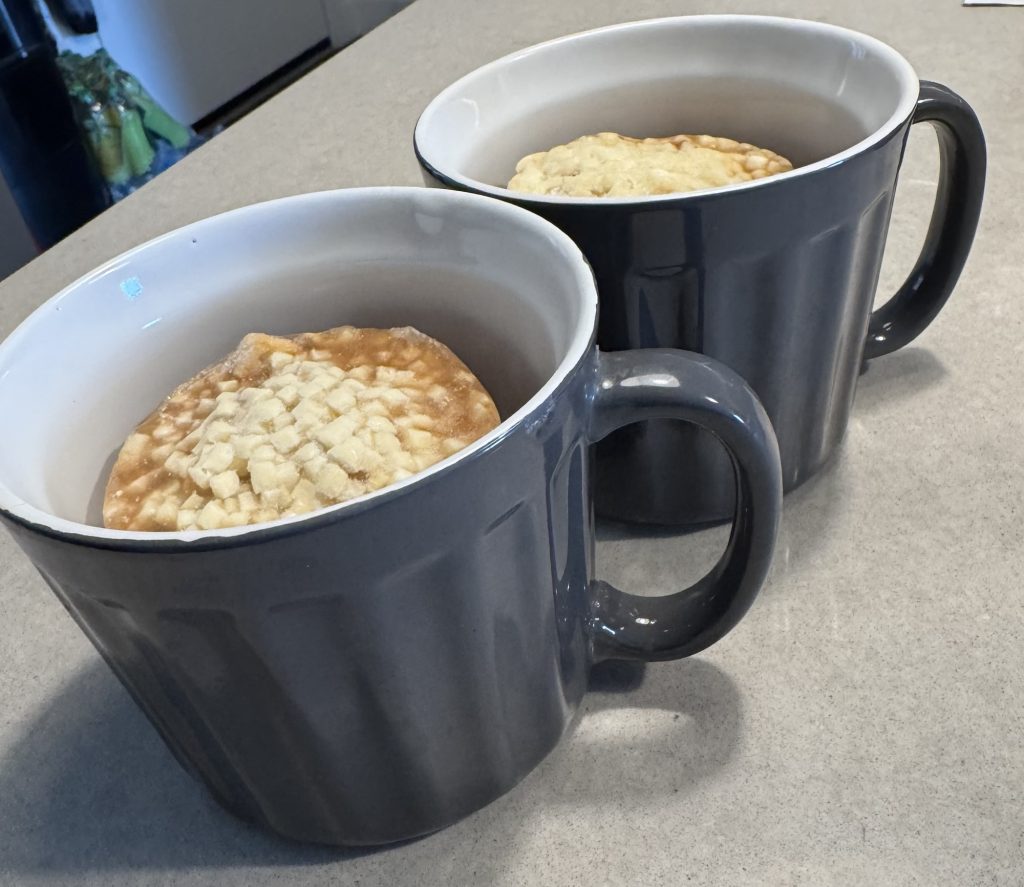 I used the oven-safe mugs in the photos (from Amazon). They have lids, which makes leftovers easy and keeps cleanup minimal. I like versatile kitchen items, it’s a cup, a bowl, microwave safe, oven safe, Tupperware all in one. Very useful and space saving.